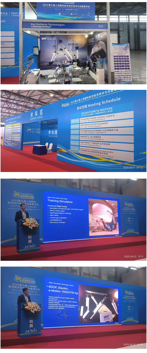 2025年6月,上海朗信攜手荷蘭VHT公司參加上海航展;繼德國力士樂之后接力繼續為中國民航航空模擬培訓事業提供六自由度平臺解決方案。